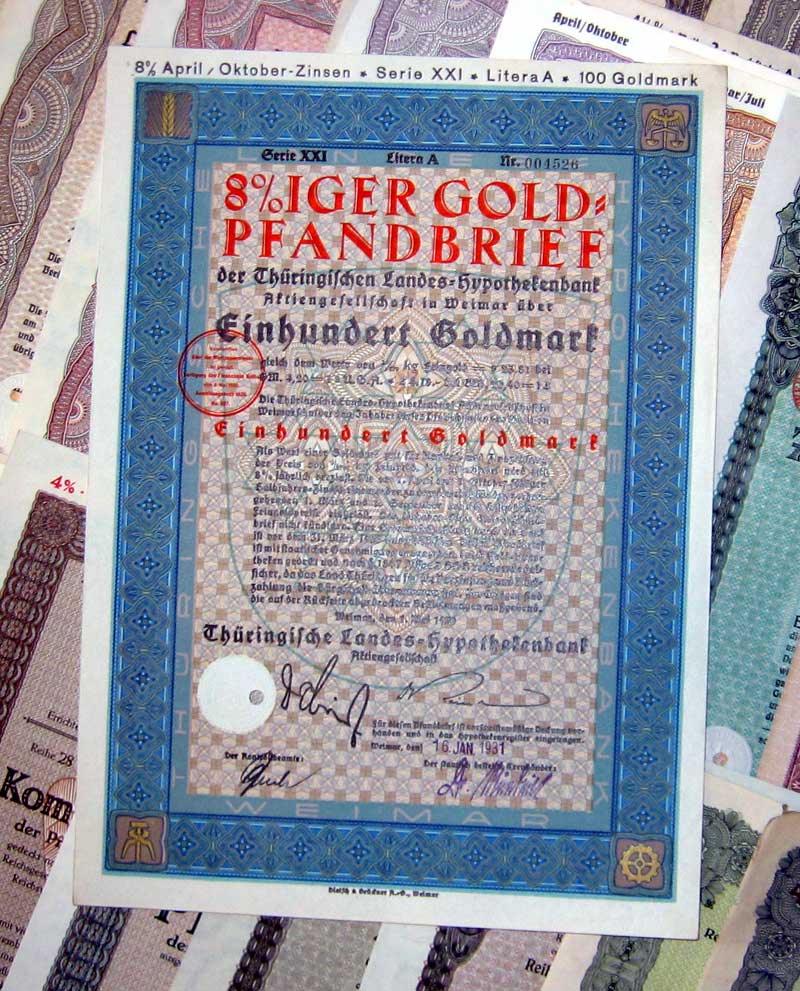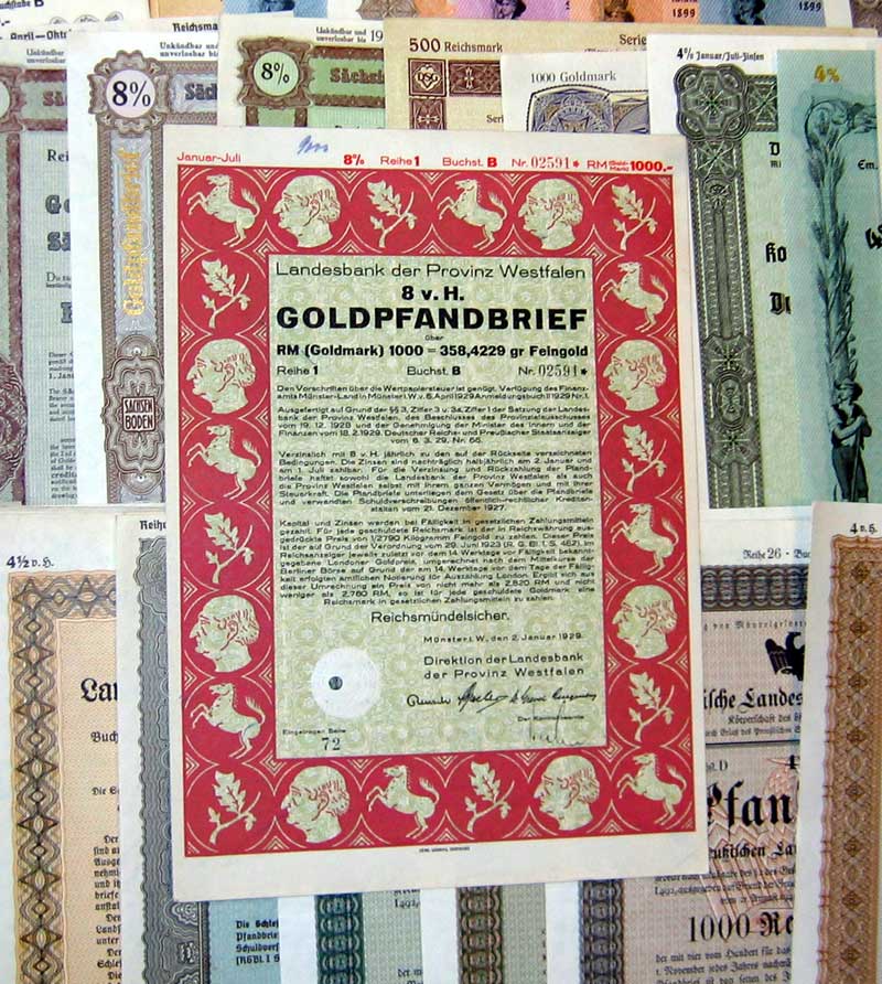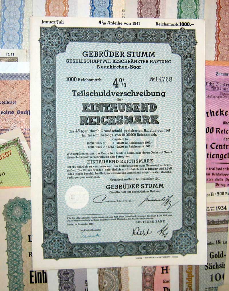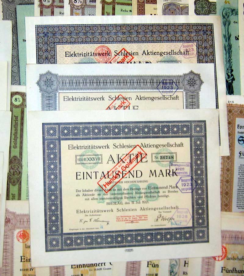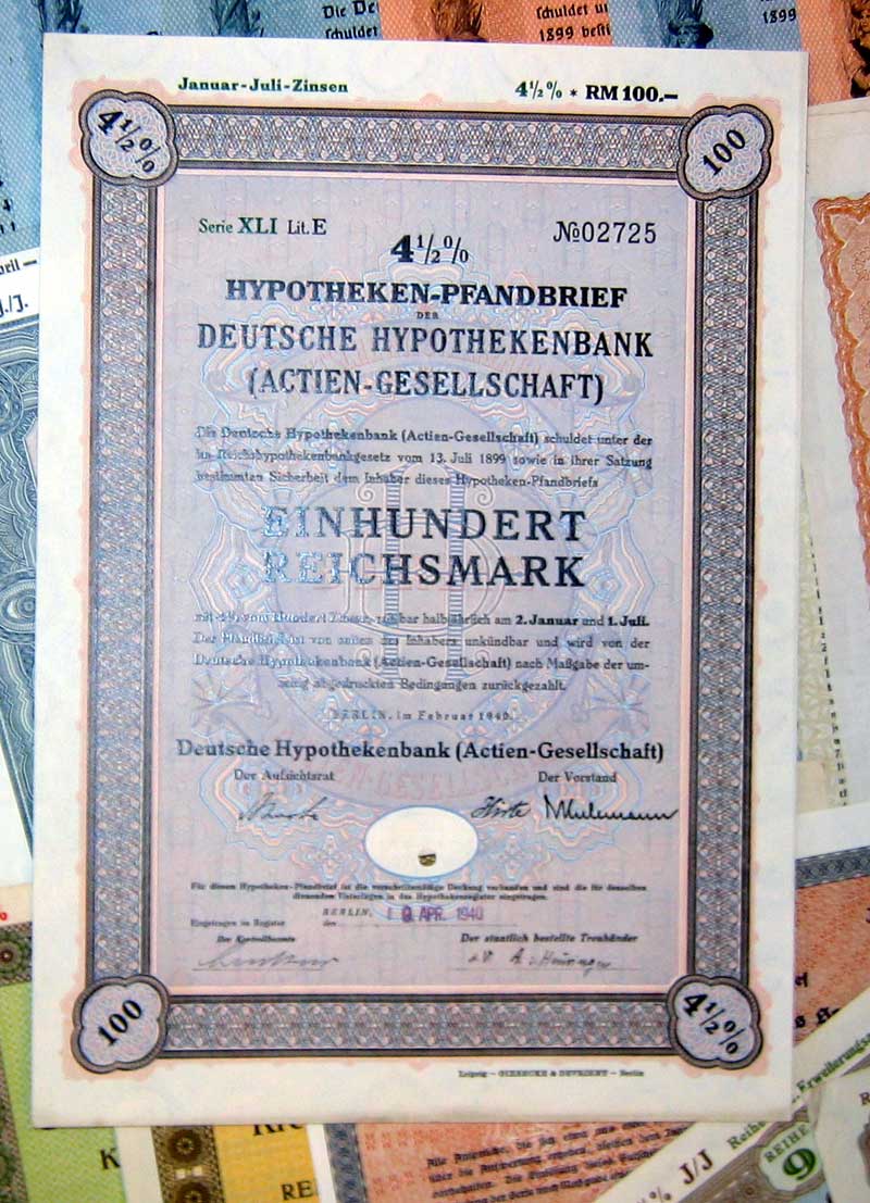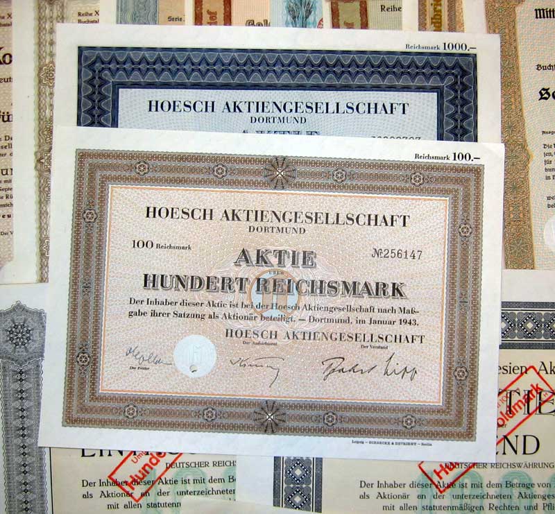 Die Papiere stammen überwiegend aus dem sogenannten Reichsbankschatz, aber auch teilweise aus anderen Quellen und werden von uns individuell zusammengetragen und versteigert. Eine gleiche Zusammenstellung können wir daher auf keinen Fall noch einmal liefern. Beachten Sie bitte, daß die abgebildeten Wertpapiere nicht immer unbedingt identisch, aber garantiert sortengleich mit den gelieferten Papieren sind, weil wir teilweise Fotos von häufigeren Wertpapieren aus Zeitersparnisgründen wiederverwenden.