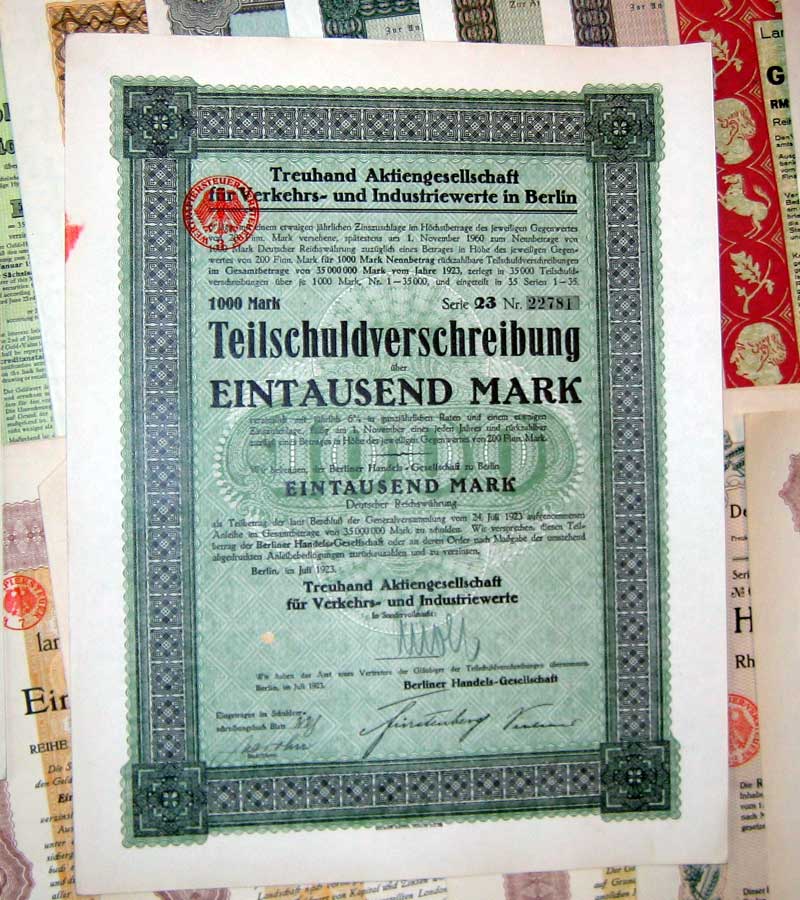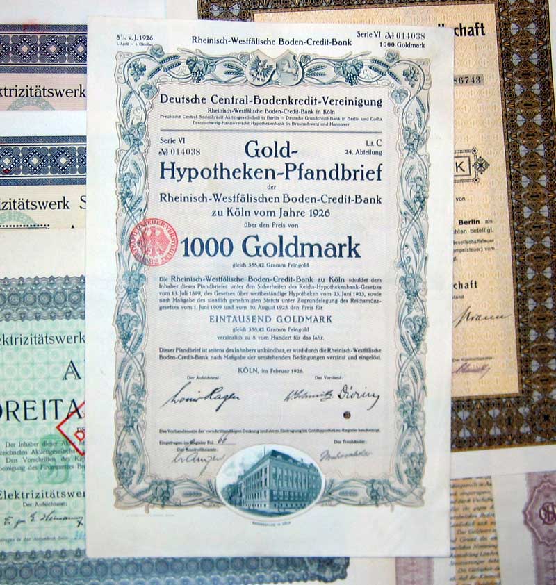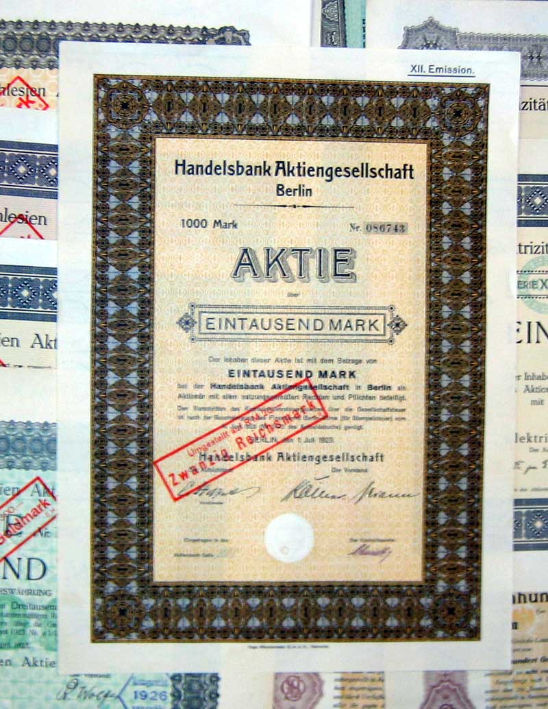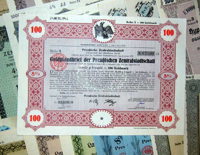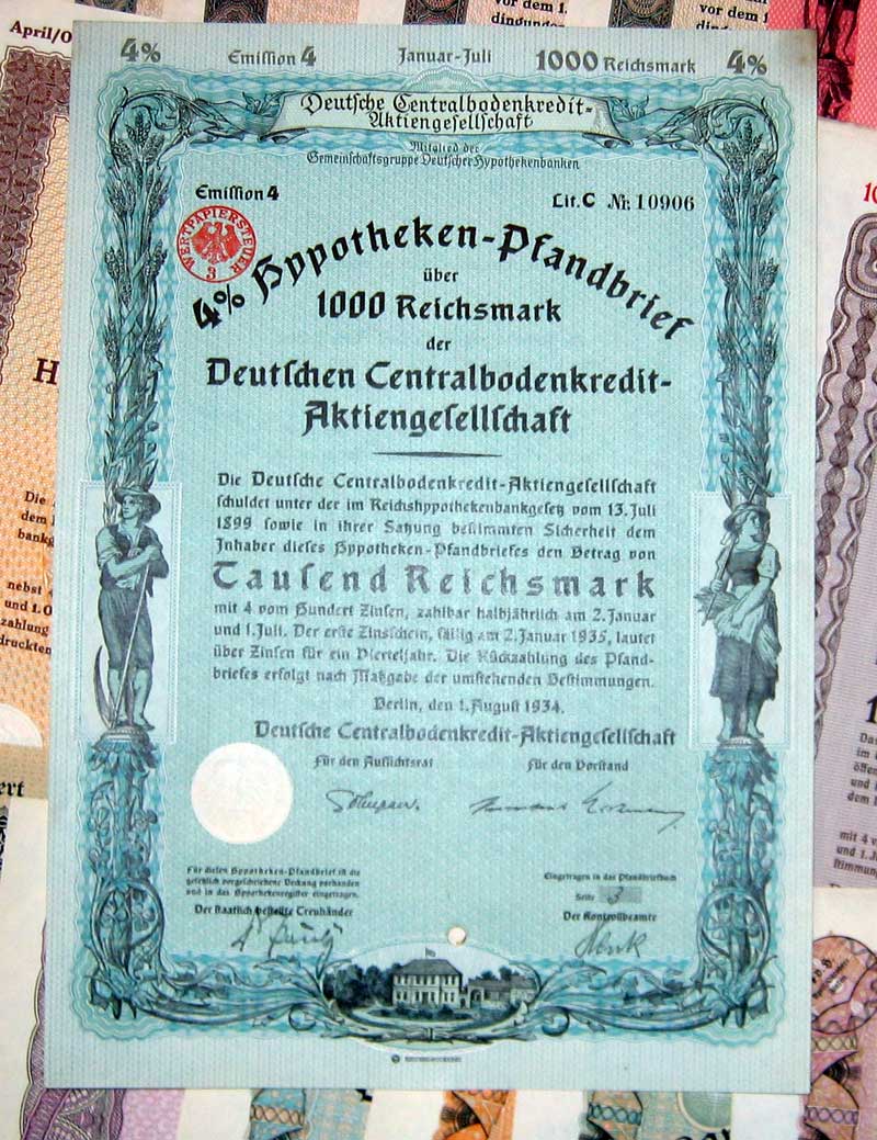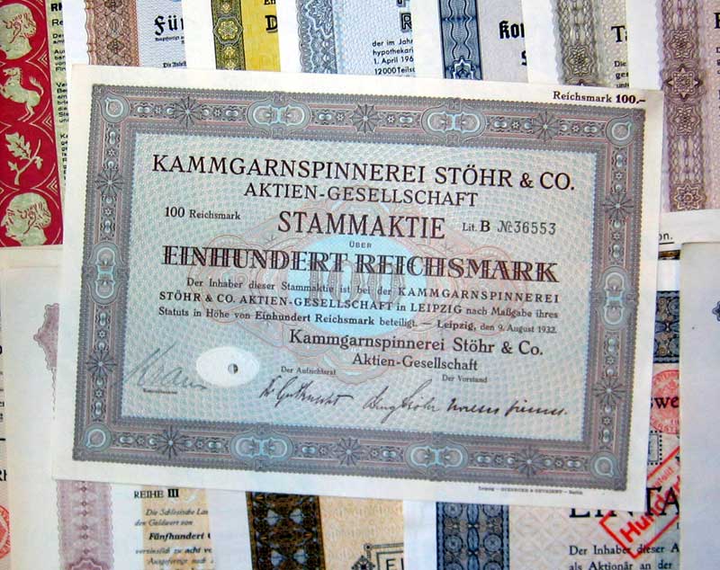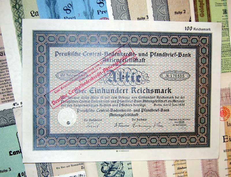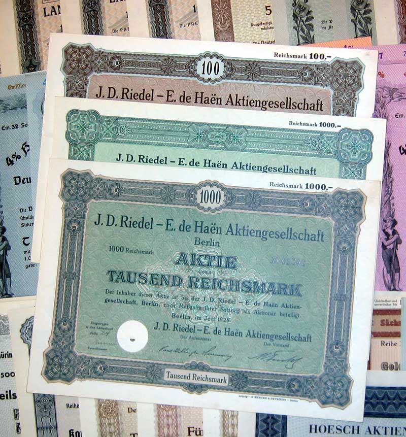 Die Papiere stammen überwiegend aus dem sogenannten Reichsbankschatz, aber auch teilweise aus anderen Quellen und werden von uns individuell zusammengetragen und versteigert. Eine gleiche Zusammenstellung können wir daher auf keinen Fall noch einmal liefern. Beachten Sie bitte, daß die abgebildeten Wertpapiere nicht immer unbedingt identisch, aber garantiert sortengleich mit den gelieferten Papieren sind, weil wir teilweise Fotos von häufigeren Wertpapieren aus Zeitersparnisgründen wiederverwenden.