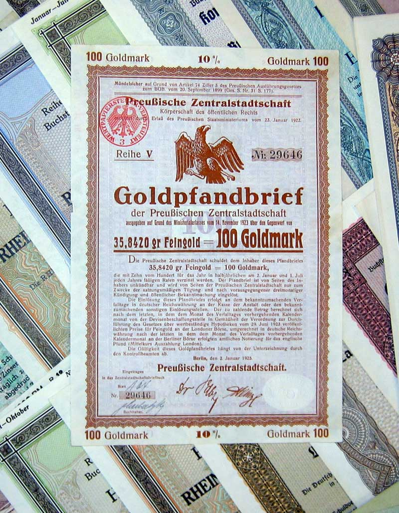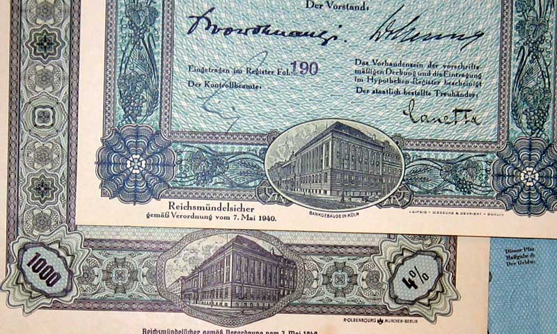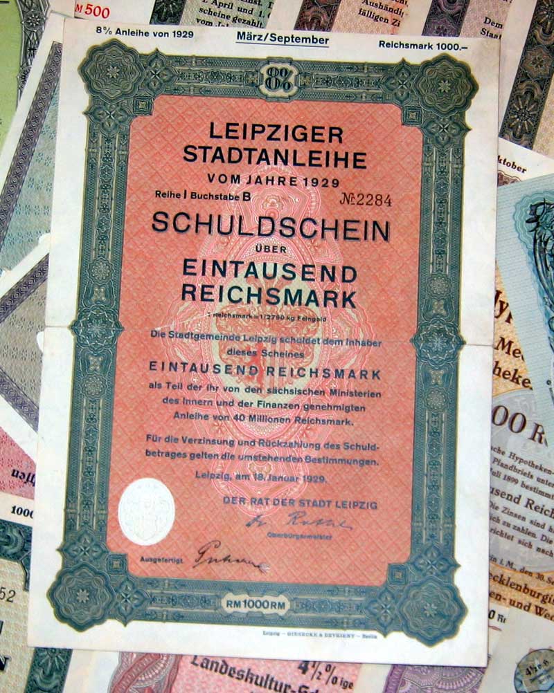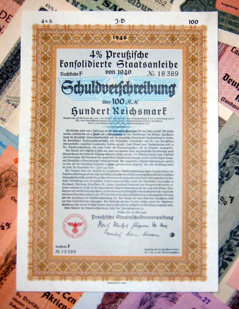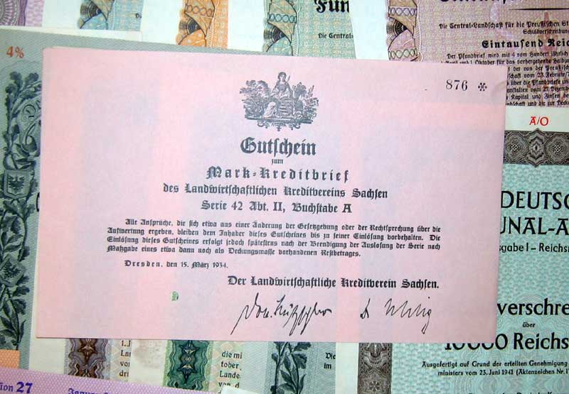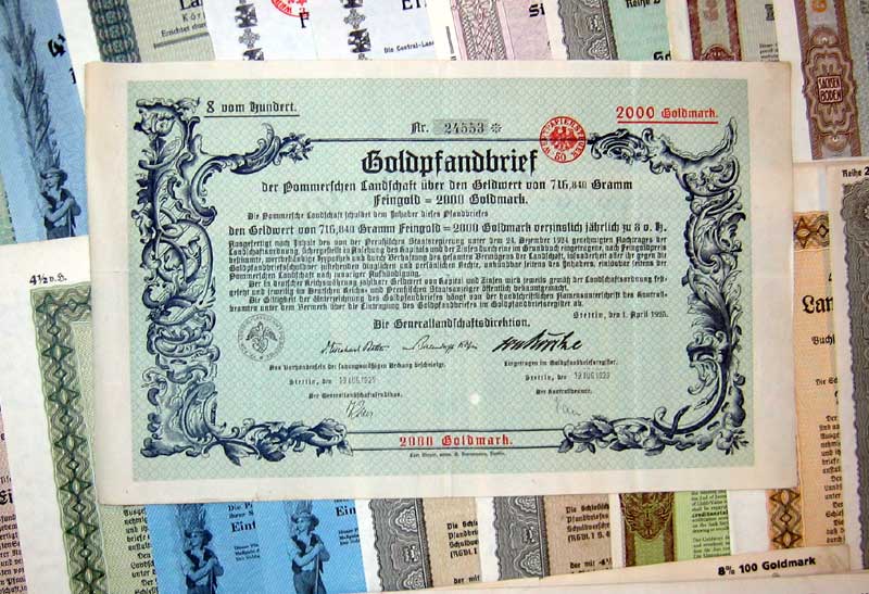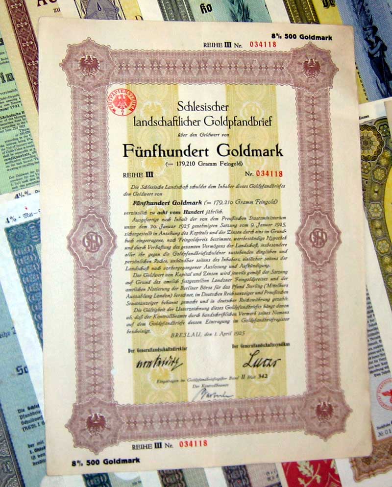 Die Papiere stammen überwiegend aus dem sogenannten Reichsbankschatz, aber auch teilweise aus anderen Quellen und werden von uns individuell zusammengetragen und versteigert. Eine gleiche Zusammenstellung können wir daher auf keinen Fall noch einmal liefern. Beachten Sie bitte, daß die abgebildeten Wertpapiere nicht immer unbedingt identisch, aber garantiert sortengleich mit den gelieferten Papieren sind, weil wir teilweise Fotos von häufigeren Wertpapieren aus Zeitersparnisgründen wiederverwenden.