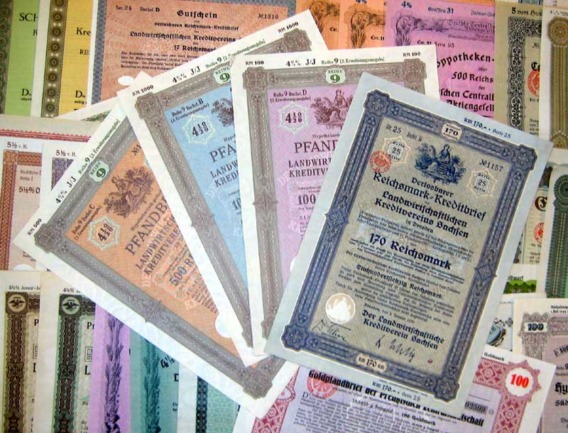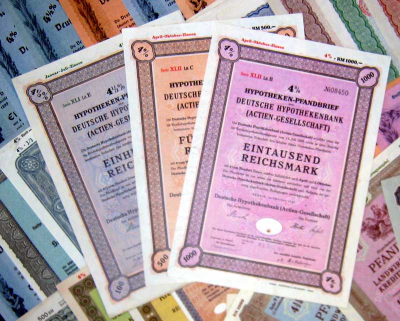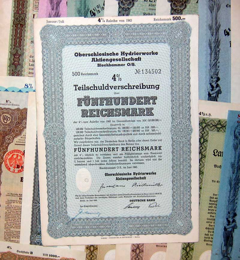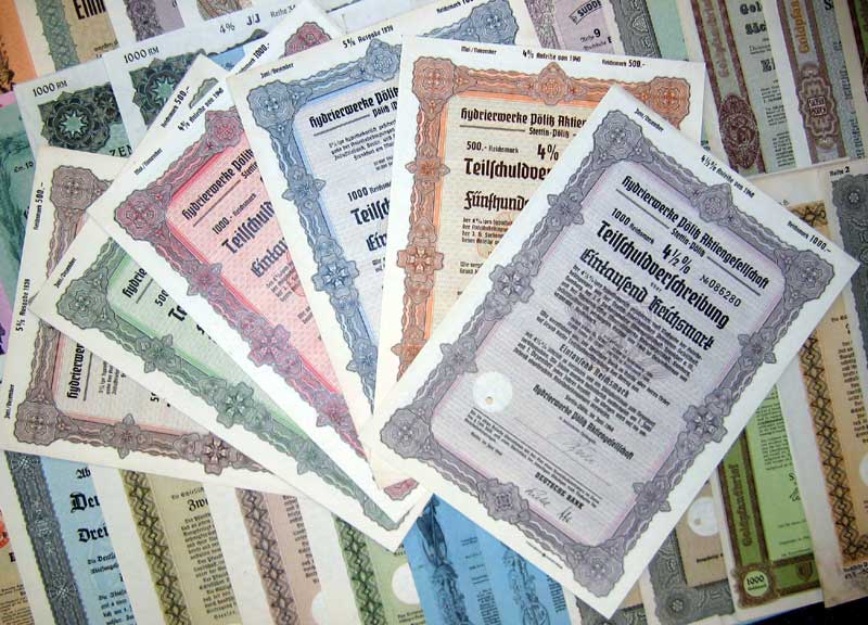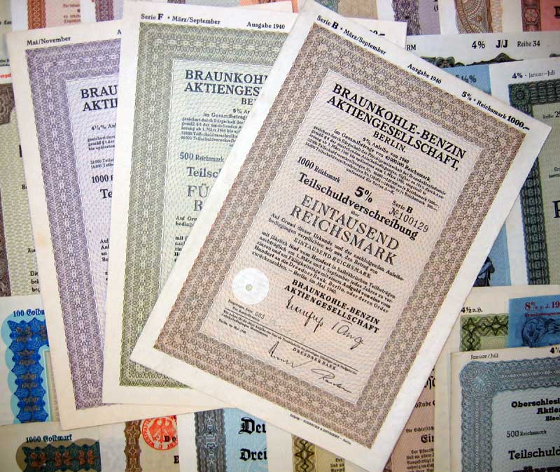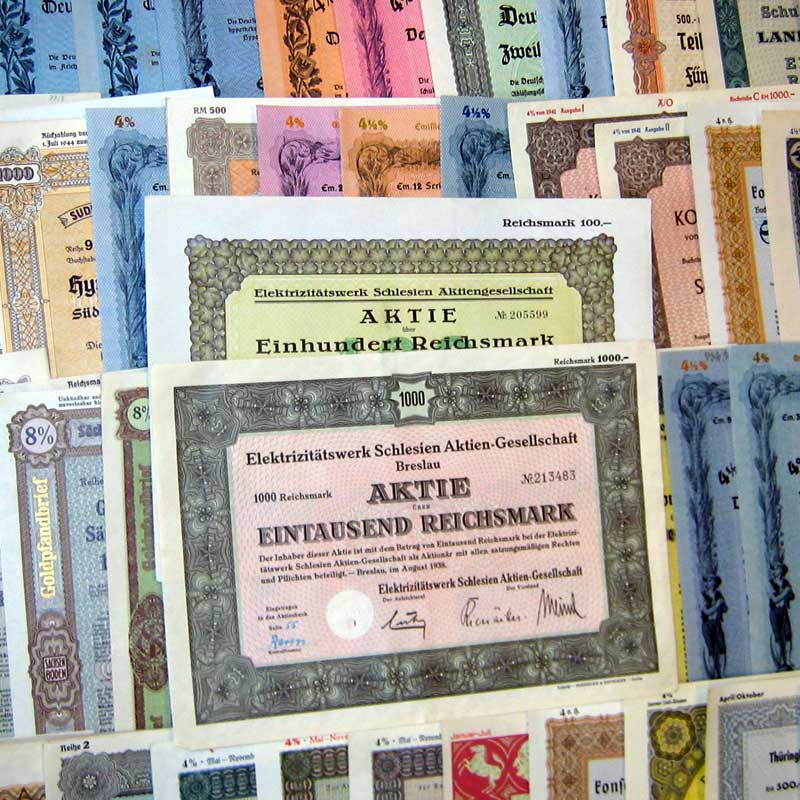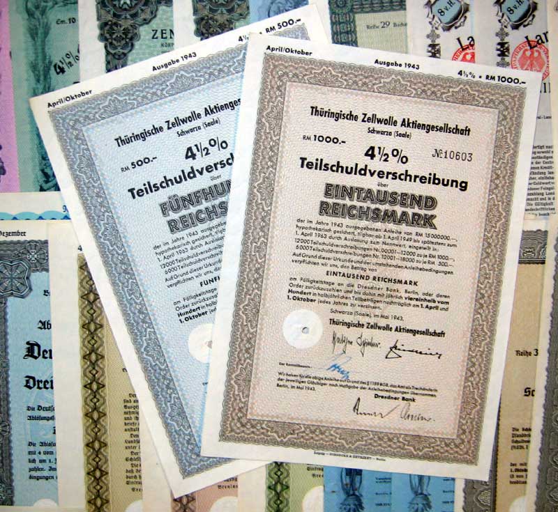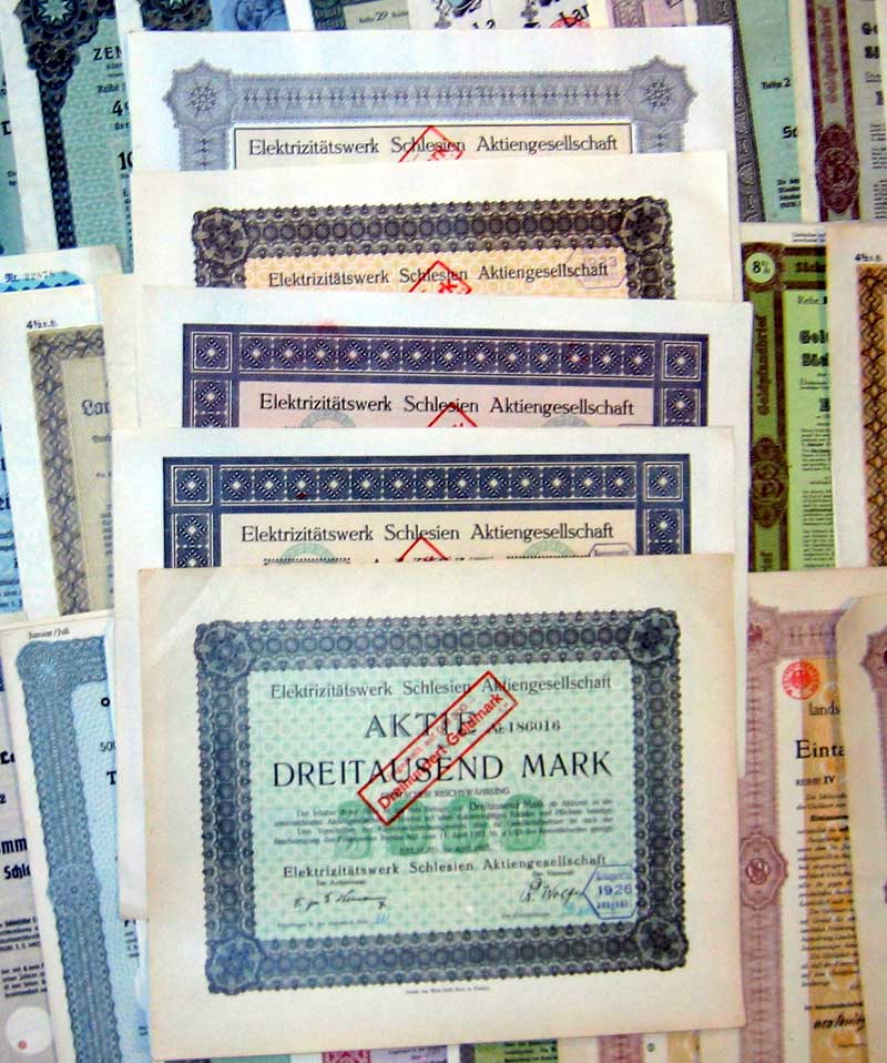 419 verschiedene echte und originale Aktien und Anleihen aus den Jahren 1913-1944, alles in sammelwürdiger Erhaltung. Dabei wissentlich keine Knochen bzw. keine 3. Wahl.