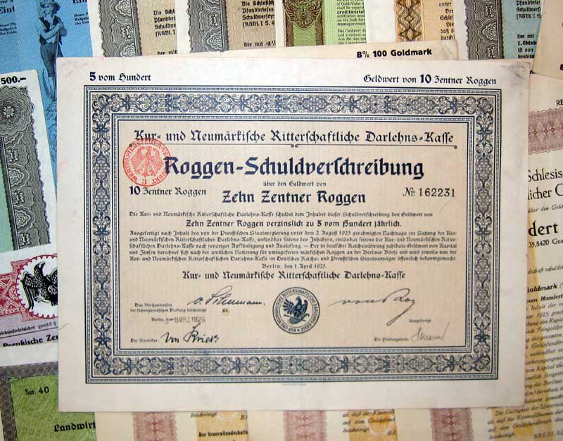 Dabei die seltenen Wertstufen 2.000, 3.000, 5.000, 10.000 und 50.000 Reichsmark. Währungen: Reichsmark, Goldmark, Mark, Roggen.