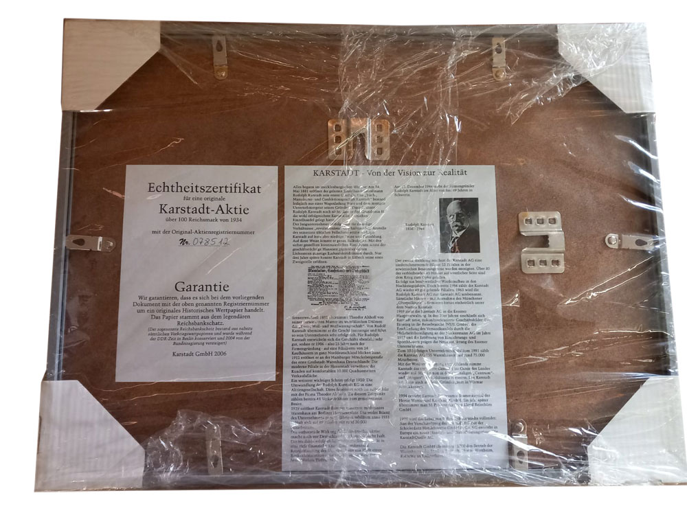 Wertpapier im Bilderrahmen - Rudolph Karstadt AG über 100 Reichsmark ausgegeben in Berlin, 6.2.1934. Größe des Rahmens: 32 x 41,5 cm.