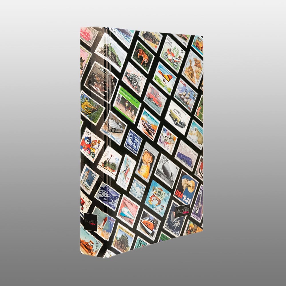 Stamp Motif Stockbook, 9 glassine strips per page, 2 glassine interleaves per sheet, all pages with stable double hinge binding, 64 white pages, making it suitable for thousands of stamps. Cover with durable and washable paint foil, printed with the most interesting stamp designs in the world, branded product from Lighthouse. Format: 9 x 12 inches (23 x 30.5 cm). Note: You buy a valuable product from Prophila. This album is made by Lighthouse for Prophila.