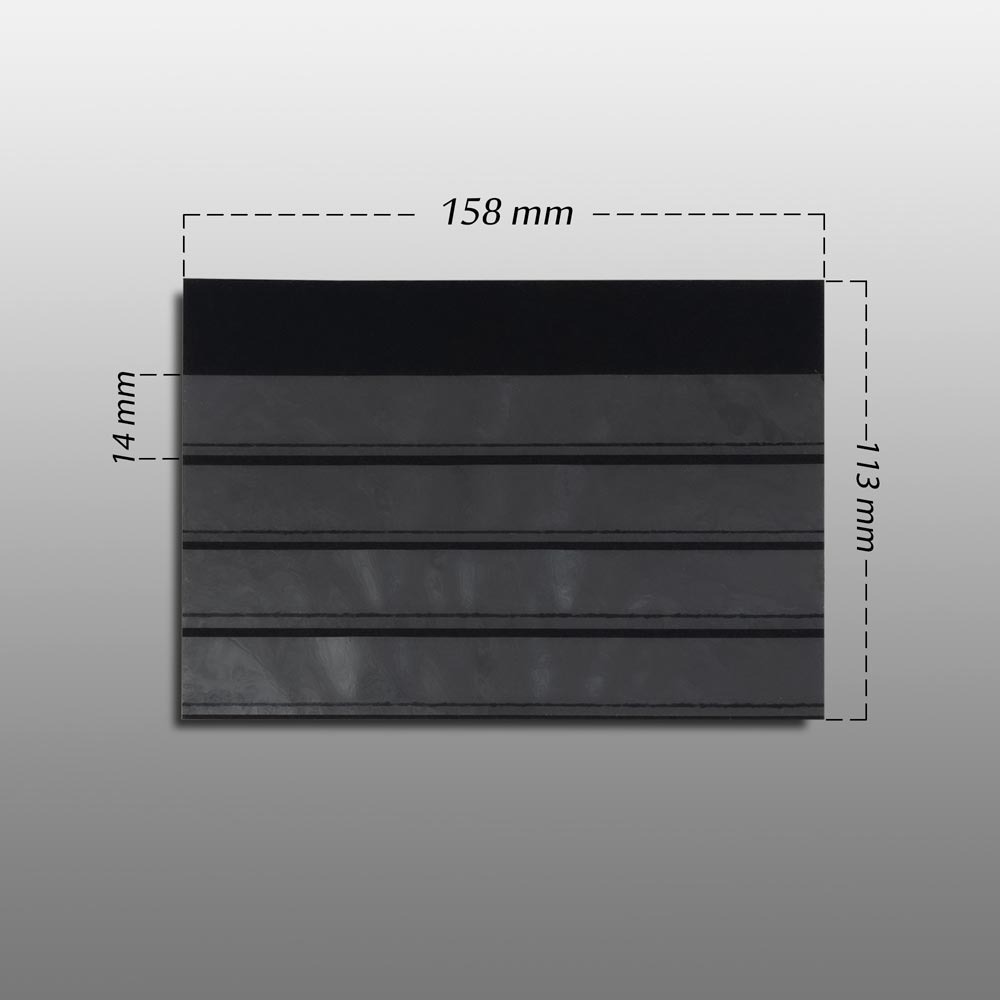 100 Steckkarten ohne Schutzfolie. Mit 4 Streifen aus glasklarer, weichmacherfreier Hartfolie 0,04 mm dick. ca. Normformat DIN C6 quer. Aus sehr stabilem, hochwertigem, schwarz durchgefärbtem Zellstoffkarton 275 g/qm. Formatgleich auch mit allen Prophila-Verpackungskarten. Passend in die Prophila Sammelbox. Größe außen: 156 x 112 mm. Streifenhöhe: 20 mm (verfügbar für Marken: 17 mm), öffnung oben. Verpackungs-Maße: 156 x 112 x 45 mm.
