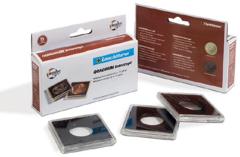 Quadrum Intercept - Die eckige Münzkapsel mit aktivem Anlaufschutz QUADRUM Intercept beschreibt eine ganz neue Technologie des Münzensammelns! Das Material schützt Ihre Münzen aktiv vor Oxidierung. Die Schaumstoffeinlage dieser Münzkapsel basiert auf der seit über 30 Jahren patentierten Intercept-Technologie. Die im Material enthaltenen Kupferpartikel binden korrosive Gase dauerhaft und erzeugen in kürzester Zeit eine neutralisierte Atmosphäre, die die Münzen vor dem Anlaufen schützt (garantierter Schutz bis zu 15 Jahren!). Die Wirkung wurde u.a. nach den bewährten Normen DIN, EN, ISO und ASTM nachgewiesen. Erhältlich für alle Münzen von 14 bis 41 mm Durchmesser (in Millimeter-Schritten)