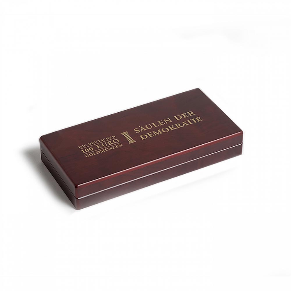 Coin etui in elegant, mahogany-stained wood grain finish for 3 German 100-euro gold coins of the series “pillars of democracy” in original capsules. 1 tray with red, velour-like surface and 3 round cavities (Ø 33.5 mm / 1 3/8"). Gold-colored printing on lid and cushion. The lid cushion is covered in red satin. Secure and unobtrusive magnetic fastener. Overall size: 193 x 93 x 33 mm (7 5/8 x 3 5/8 x 1 1/3"). Capsules are not included.