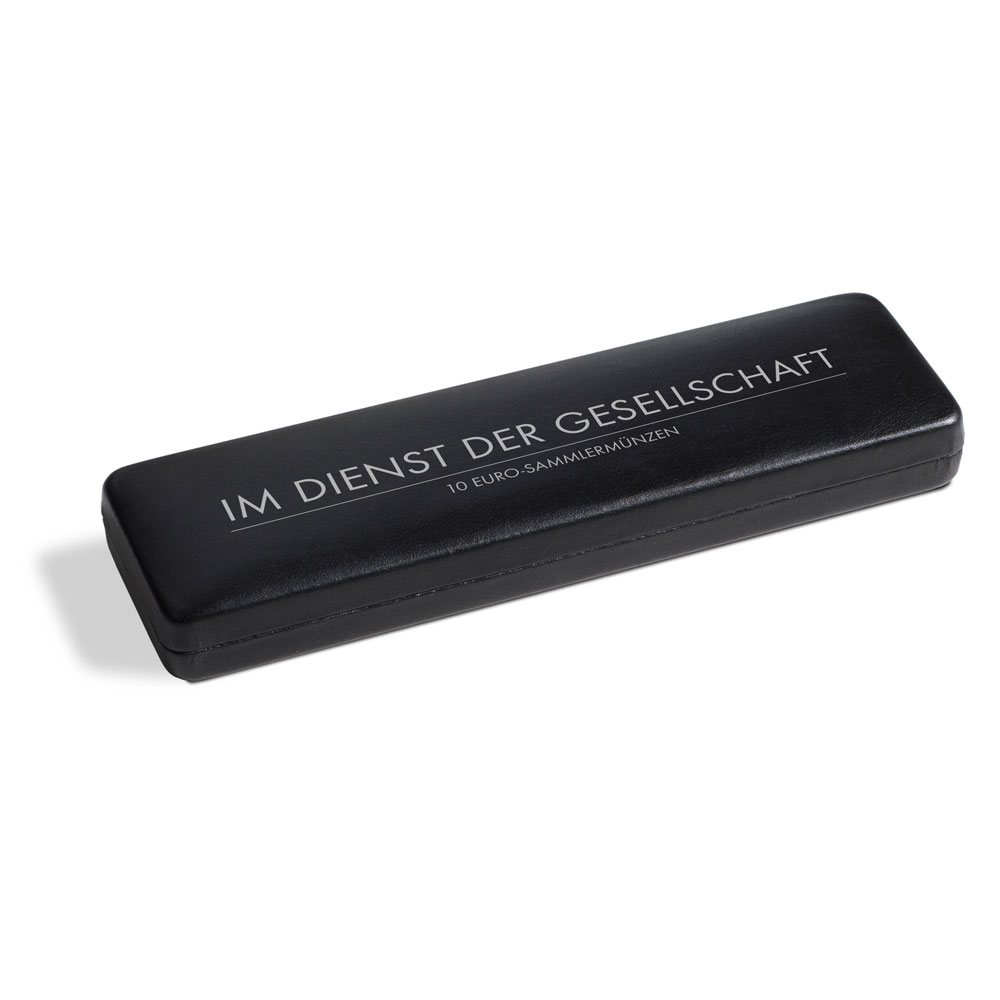 This noble case in leather optic stores five Germany 10-euro collector coins (2022-2026) of the „In Service to Society“ series in ULTRA Perfect Fit capsules (inner Ø 29 mm). Sturdy metal housing padded and wrapped in finely structured black synthetic leather. One inlay with black, velour-like surface and five round cavities (Ø 35 mm). Lid cushion upholstered in white satin. Including white satin band to hold a certificate. Noble, silver coloured lid print. Outer size: 235 x 65 x 25 mm. Capsules not included.