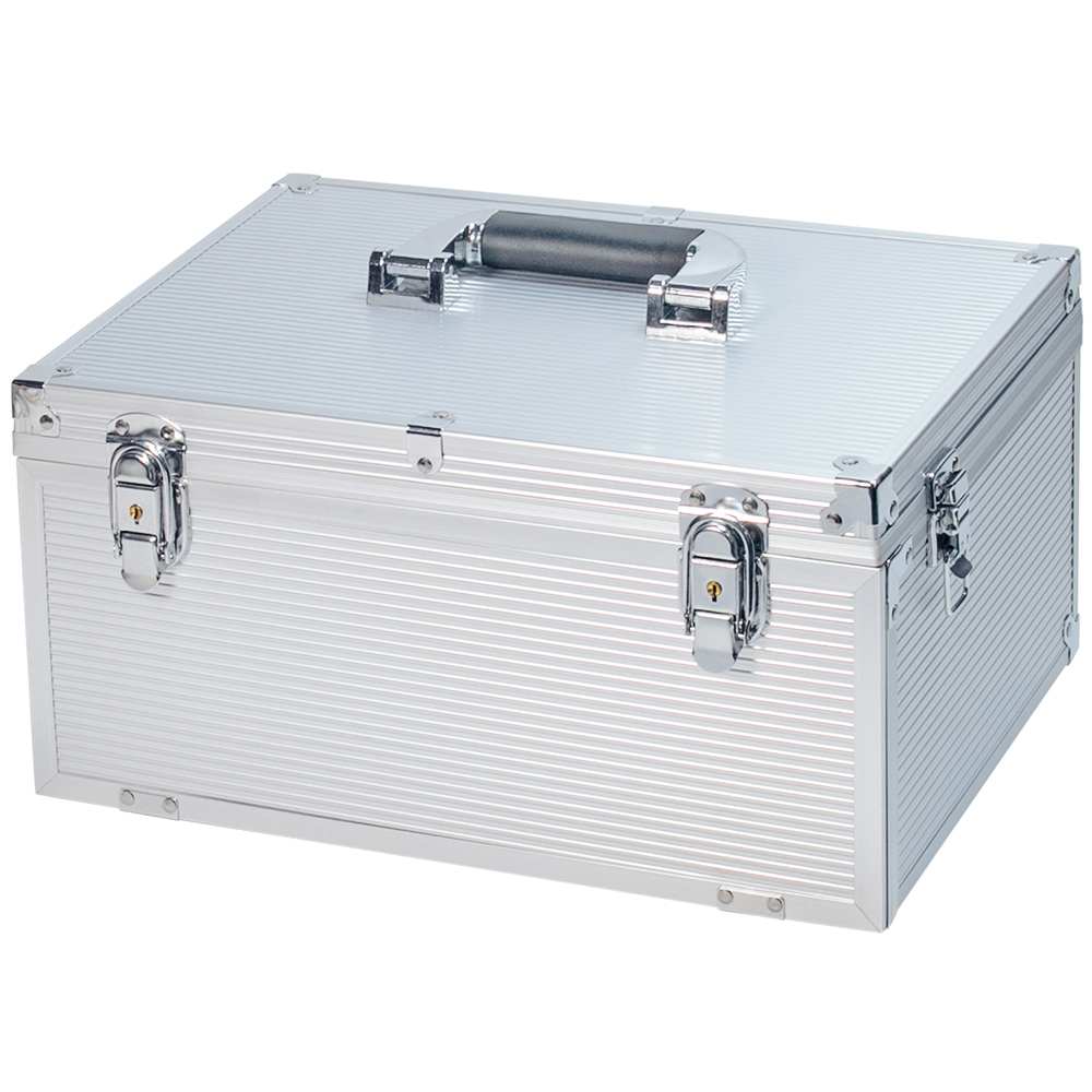 Großer, abschließbarer Sammelkoffer im edlen Aluminium-Design.Kunststofffüße garantieren einen sicheren Stand und schützen den Tisch, das Regal etc. vor Kratzern.Die beiden zusätzlichen seitlichen Verschlüsse sorgen dafür, dass der Koffer beim Transport fest verschlossen bleibt.Fassungsvermögen: max. 17 Münztableaus.Format: 370 x 260 x 200 mm.