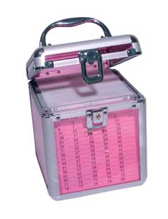 Lieferbar in den Farben blau und pink Tragegriff abschließbares Klappschloss Metallecken robuste, solide Ausführung ideal für zuhause und unterwegs mit 40 Taschen für 80 CD's / DVD's incl. Inhaltregister Abmessungen: 155 x 195 x 155 mm