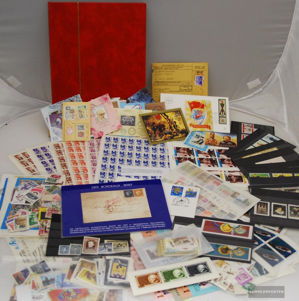 Beschreibung: (190) Eine Kiste, die es in sich hat: weit über 2.500 Marken aus aller Welt. Weit überwiegend verschiedene aus bis zu 100 Ländern. Vieles in Tüten, auf Steckkarten, auf Paper, viele Motivausgaben, sehr viele kpl. Sätze, Vorkriegsmarken, Briefe etc.. Dabei weit über 100 Blöcke, Kleinbögen, Zusammendruckbögen (Katalogwert über € 300,-). Desweiteren ca. 100, oft auch postfrische, komplette Ausgaben (Katalogwert € 200,-), 6 Komplettbögen UdSSR mit 10 Plattenfehlern, Eine Steckkarte mit ca. 50 postfrischen Marken. Das Highlight: ein sogenannter Phasendruck. Das ist eine unfertige Marke aus dem Druckvorgang mit fehlender Farbe!!! Zusätzlich noch eine umfangreiche UdSSR-Sammlung mit A4-Album mit nur kpl. postfrischen Ausgaben (Katalogwert € 100,-). Ein absoluter Leckerbissen ist die Replik der Blauen Mauritius zusammen mit der roten Schwesterausgabe auf Brief im Geschenkfolder und Beschreibungs-Booklet. Bei einem Gesamtkatalogwert von geschätzt etwa € 1.000,- kann man hier nichts falsch machen!!!Art.-Nr.: 180/078P100319